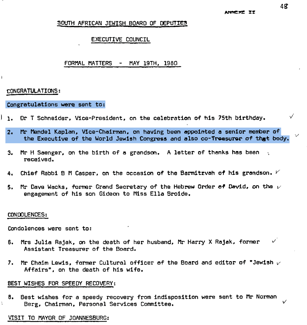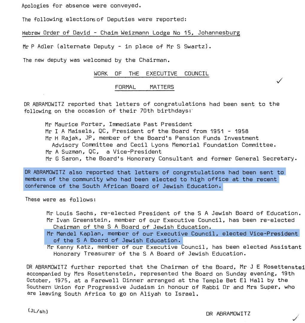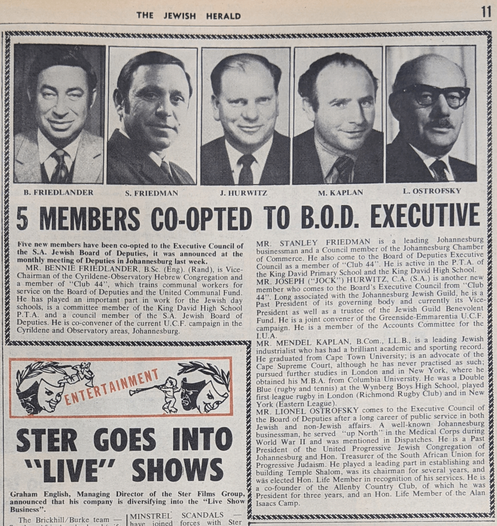 Mendel elected Vice-Chairman of the South African Jewish Board of Deputies Executive Council alongside Dr Israel Abramowitz.