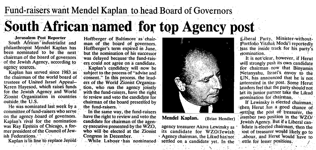 Mendel elected to the Jewish Agency for Israel (JAFI) Executive (first South African ever). JAFI is an agency focussed on immigration to Israel and the integration of Jewish immigrants.