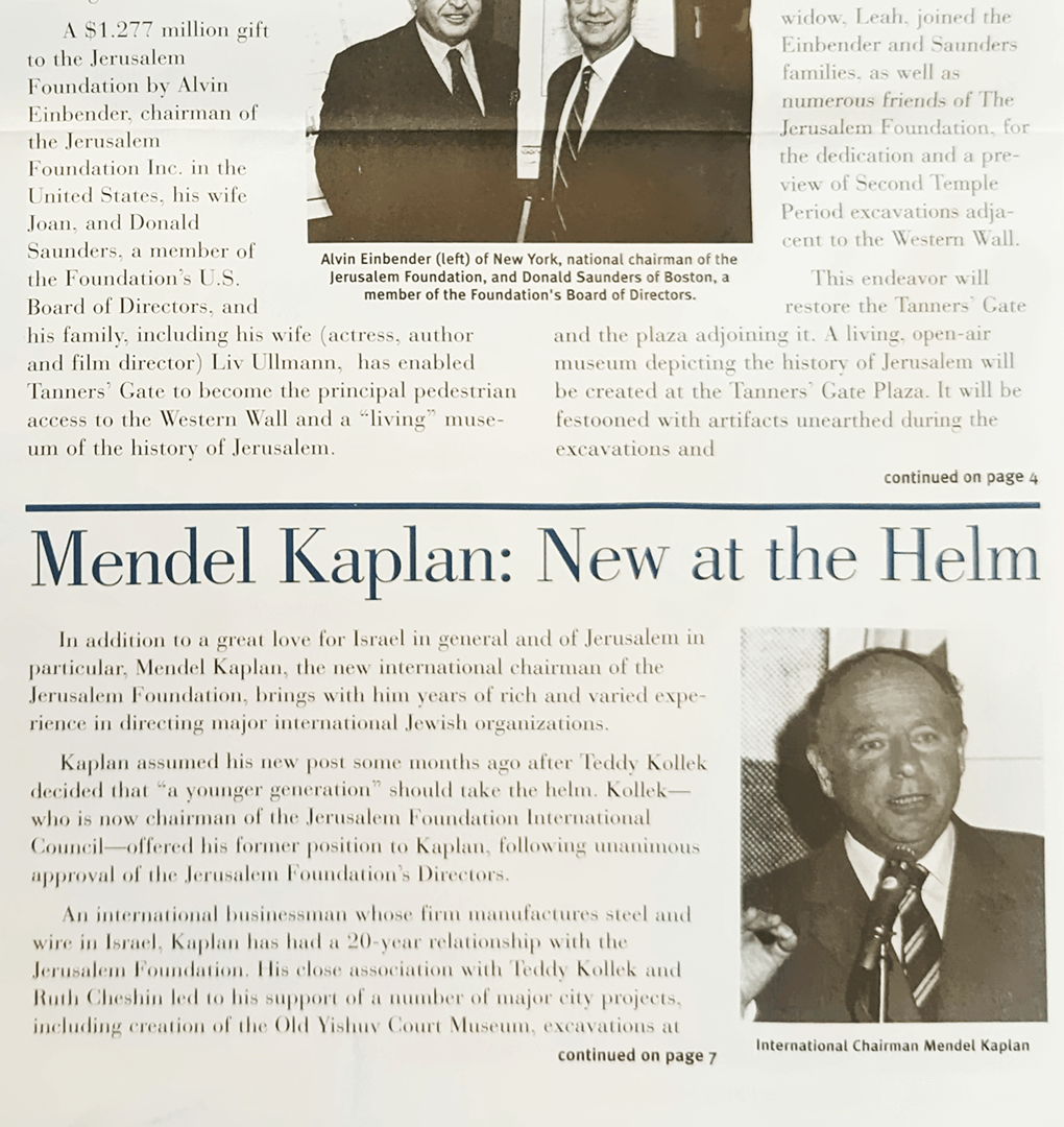 Mendel appointed Chairman of the Jerusalem Foundation (serves until 1998). The Jerusalem Foundation develops, funds and oversees socio-cultural initiatives in Jerusalem.