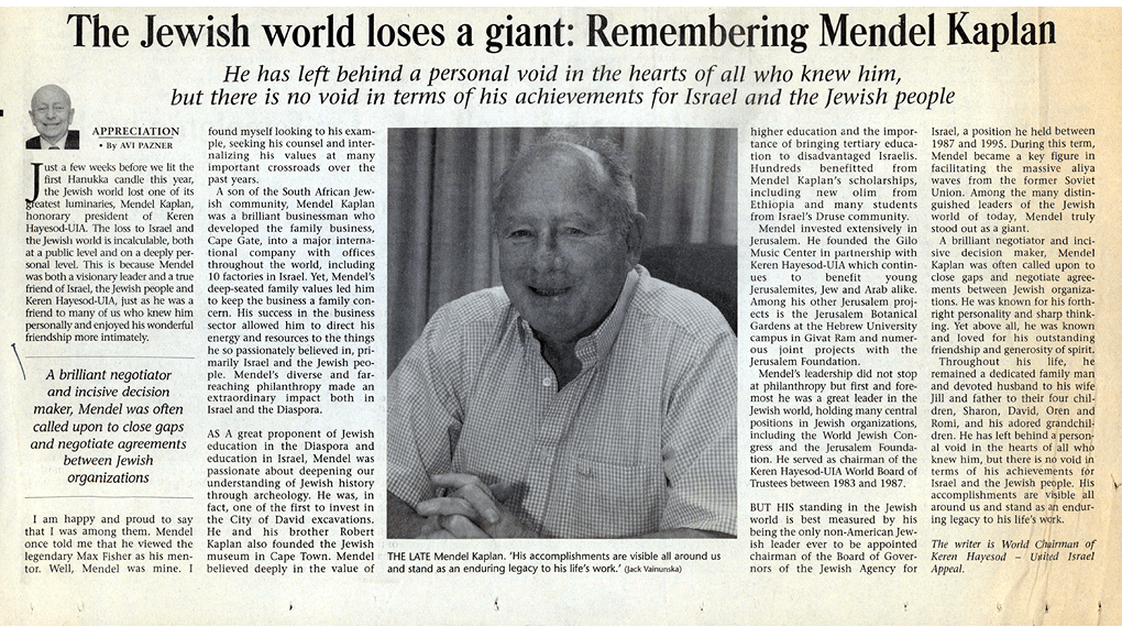 Mendel made a member of the World Board of Trustees of the Keren Hayesod, the global fundraising body for Israel.