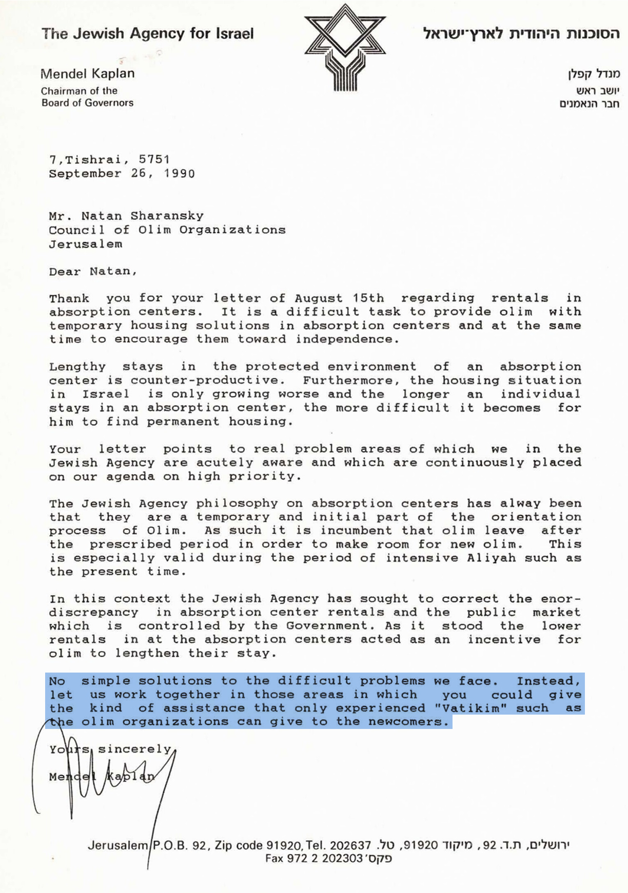 Mendel’s response was firm but measured—until the final line. A subtle but unmistakable message to Sharansky: “let us work together in those areas in which you could give the kind of assistance that only experienced ‘Vatikim’ such as the olim organisations can give”—i.e. Stay in your lane.