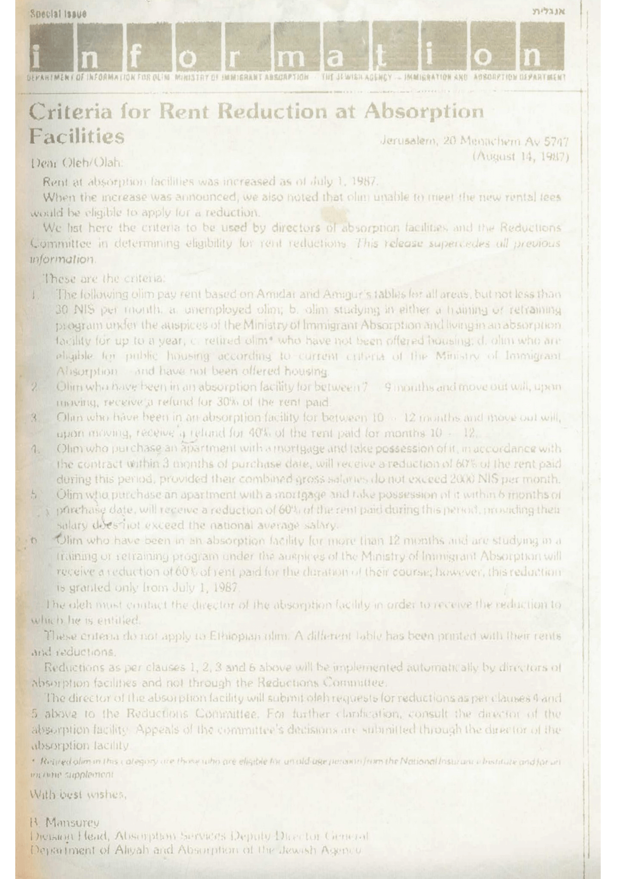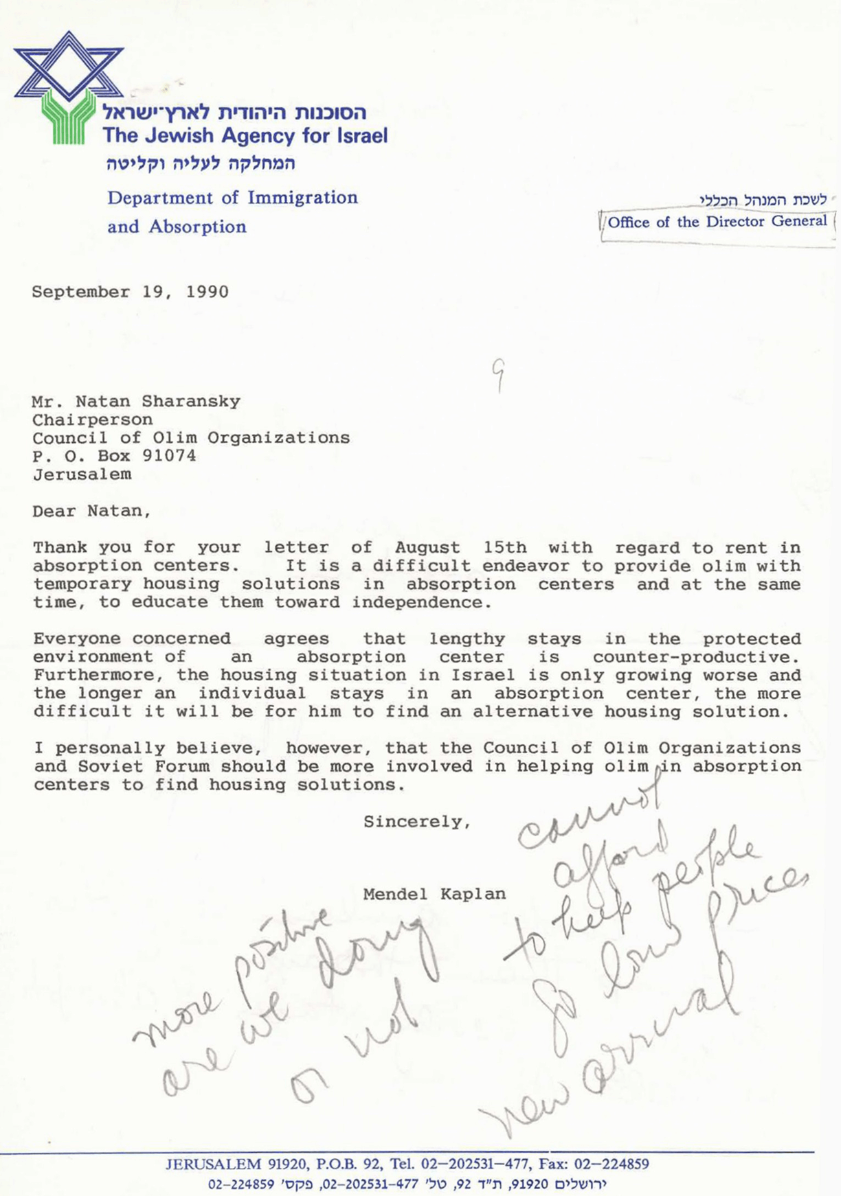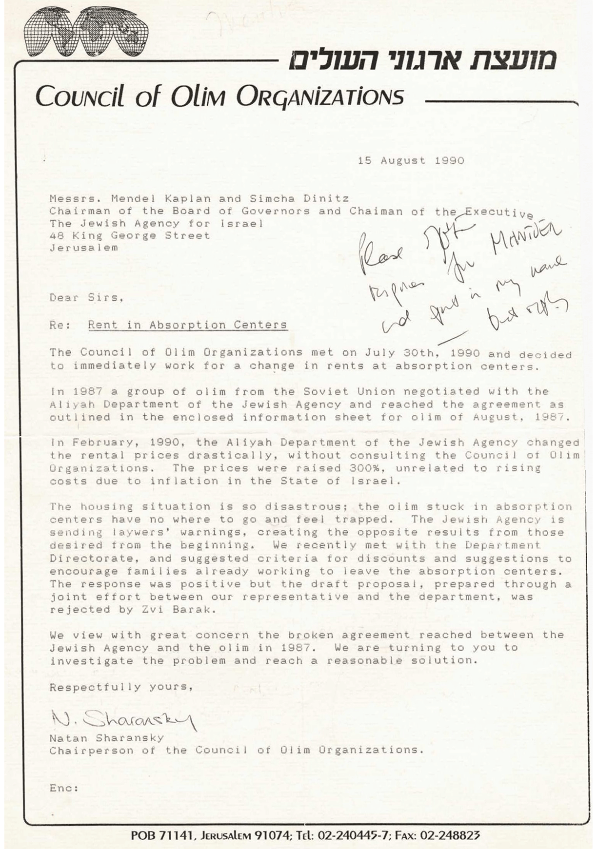 In August 1990, a letter from Natan Sharansky landed on Mendel’s desk—respectful, but not entirely friendly. Sharansky laid out a history of betrayal, accusing the Jewish Agency of breaking its agreement with olim. The flashpoint? A shocking 300% rent hike for absorption centre dwellings which, in his view, crippled struggling immigrants.